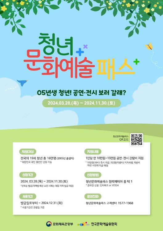청년문화예술패스는 민법상 성년이 되는 전국 19세 청년에게 1인당 순수예술 공연과 전시 관람비를 최대 15만원까지 지원하는 사업으로 소득과 관계없이 국내에 거주하는 2005년생 대한민국 청년이라면 누구나 신청할 수 있다.