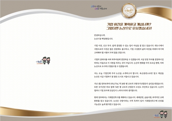 이 세 곳 산단에 소재한 761개 기업에 市는 지난 3월 논산시장 명의로 기업 유치 서한문을 발송했는데, 물류 여건이 좋고 인근 대도시를 통한 인재 수급이 원활하다는 내용이 포함됐다.