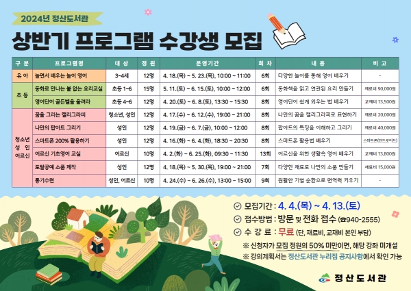 참여 신청은 도서관 직접 방문이나 전화접수로 가능하고 강의별 자세한 내용은 정산도서관 누리집 공지 사항에서 확인할 수 있으며 기타 궁금한 사항은 정산도서관에 문의하면 된다.