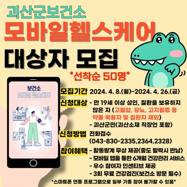 [충청뉴스큐] 충북 괴산군 보건소는 군민들의 건강증진을 위한 2024년 모바일 헬스케어사업 참여자 50명을 선착순으로 모집한다고 밝혔다.