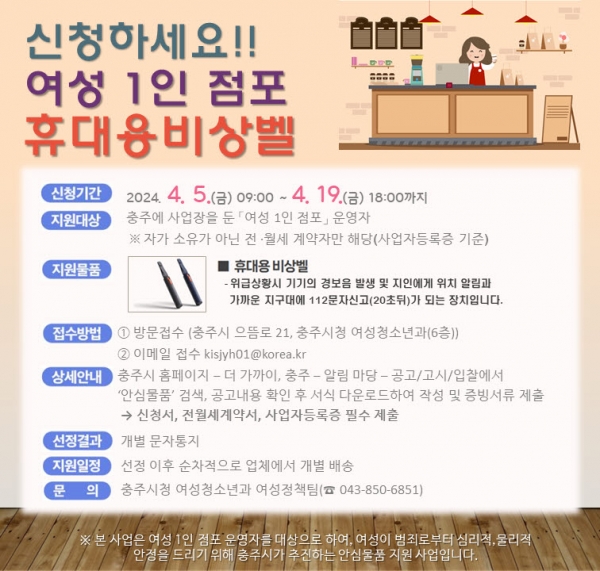 시는 이미용업, 카페, 피부 관리샵, 옷 가게 등 여성 1인 소규모 점포 사업주들의 안전한 가게 운영을 도모하고자 지난 3월 4일 충주경찰서와 휴대용 비상벨 지원, 위기 상황 발생 시 경찰력 동원 등 피해자 보호를 위한 업무 협약을 체결한 바 있다.