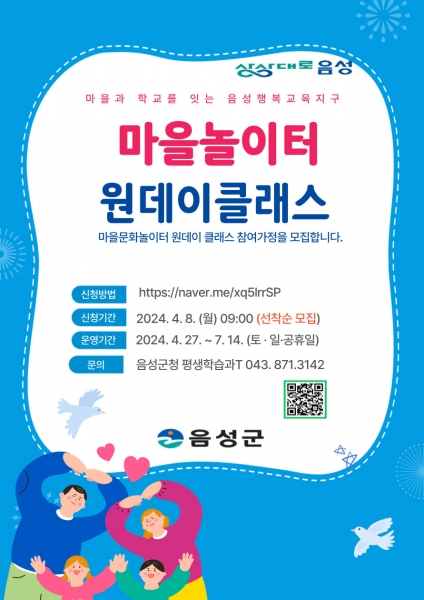 [충청뉴스큐] 음성군은 이달 27일부터 7월 14일까지 매주 주말마다 체험처를 활용해 학부모와 함께하는 ‘마을 문화놀이터 원데이클래스’ 사업을 운영한다.
