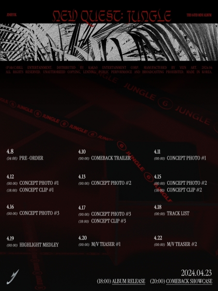 소속사 빌엔터테인먼트는 5일 자정 공식 SNS 계정을 통해 이진혁의 미니 6집 ‘NEW QUEST: JUNGLE’의 스케줄러를 공개하며 컴백 초읽기에 나섰다.
