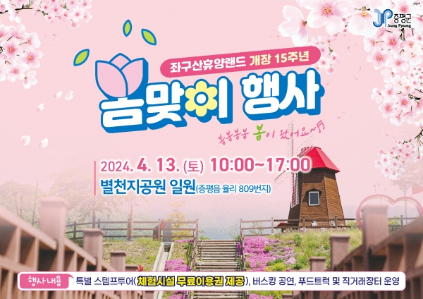 휴양랜드사업소장은 “특별 스탬프 투어 이벤트뿐만 아니라 푸드트럭, 직거래장터, 버스킹공연, 화분만들기, 에어로켓 만들기 등 다양한 부대행사가 준비돼 있다”며 “방문객들이 화창한 날씨와 함께 봄을 즐길 수 있는 행사가 되기를 바란다”고 밝혔다.