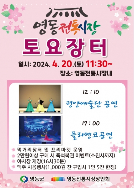 [충청뉴스큐] 충북 영동군이 ‘2024 전통시장 토요장터 및 문화공연’를 열며 침체된 지역경제와 지역사회에 활력을 불어넣는다.