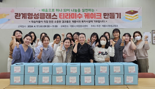 [충청뉴스큐] 계룡시가 티라미수 케이크 만들기 강의를 진행하며 학습자들이 직접 만든 케이크 21개를 계룡시 종합사회복지관에 기부했다고 밝혔다.
