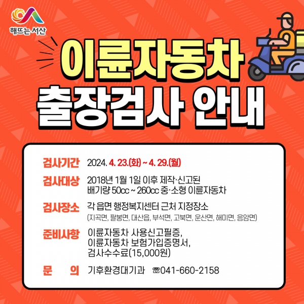 이경수 서산시 기후환경대기과장은 “먼 거리를 이동해 정기 검사를 받아야 하는 시민들의 불편함과 위험성을 해소하기 위해 진행하는 출장 검사인 만큼 이륜자동차 정기 검사 대상자분들의 많은 참여를 바란다”고 말했다.