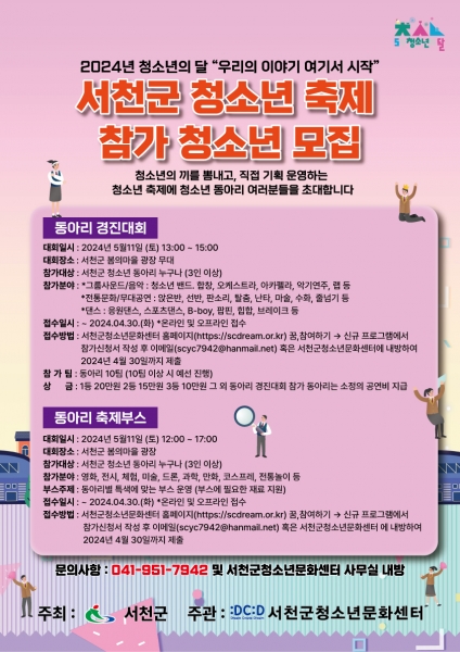 [충청뉴스큐] 서천군청소년문화센터가 5월 청소년의 달을 맞아 다음달 11일 정오부터 오후 5시까지 열리는 ‘서천군청소년축제’에 참여할 청소년 동아리 참가팀을 모집한다.