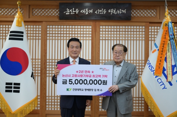 [충청뉴스큐] 지난 19일 건양대학교 설립자 겸 명예총장인 김희수 박사가 2년 연속‘고향사랑기부제’최고액인 500만원을 고향 논산시에 기부하며 남다른 고향사랑을 실천했다.