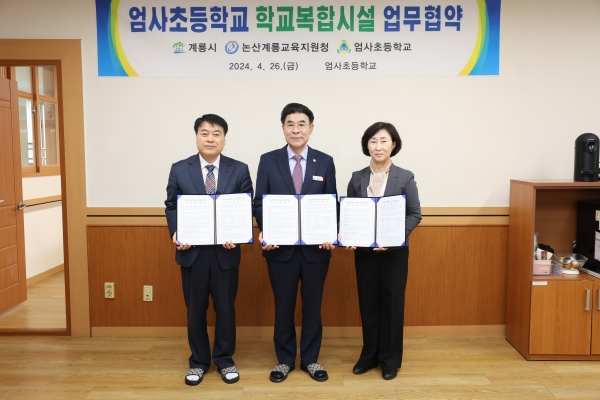 [충청뉴스큐] 계룡시는 26일 엄사초등학교에서 논산계룡교육지원청, 엄사초등학교와 학교복합시설 사업 추진을 위한 업무협약을 체결했다.
