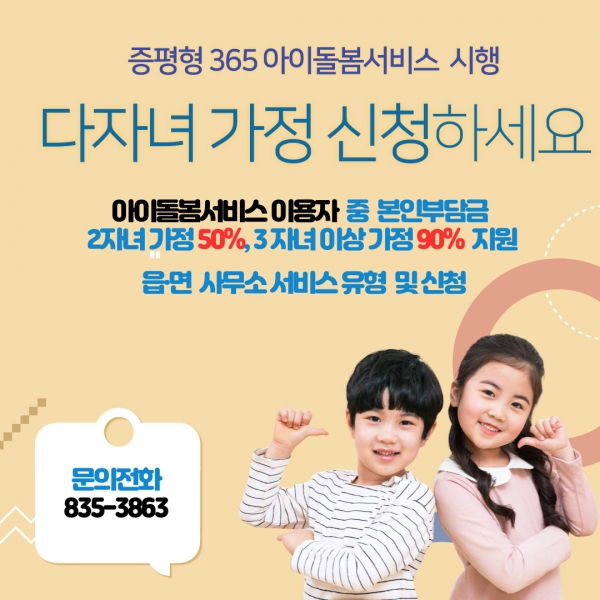 증평형 365 아이돌봄서비스는 아이돌봄서비스 이용자 중 다자녀 가정의 본인부담금을 군비로 지원하는 사업이다.