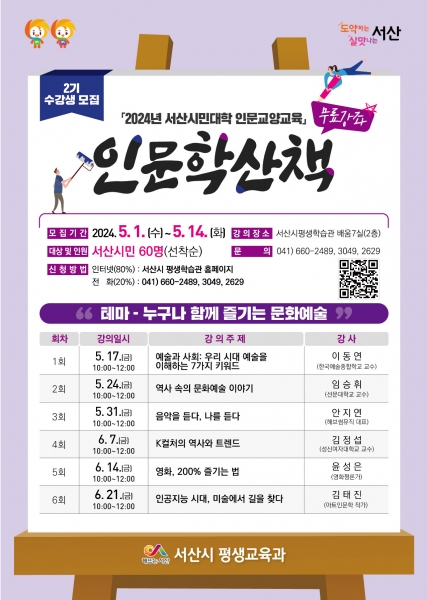 [충청뉴스큐] 충남 서산시는 시민의 인문학적 소양 함양 및 삶의 질 향상을 위해 ‘인문학 산책 2기’ 수강생 60명을 선착순 모집한다고 밝혔다.
