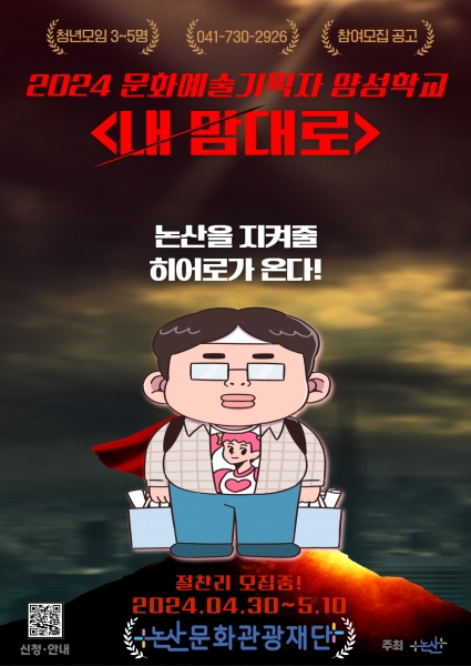 [충청뉴스큐] 논산문화관광재단은 4월 30일부터 5월 10일까지 문화예술 기획자 양성학교 ‘내 맘대로’의 참여팀을 모집한다.