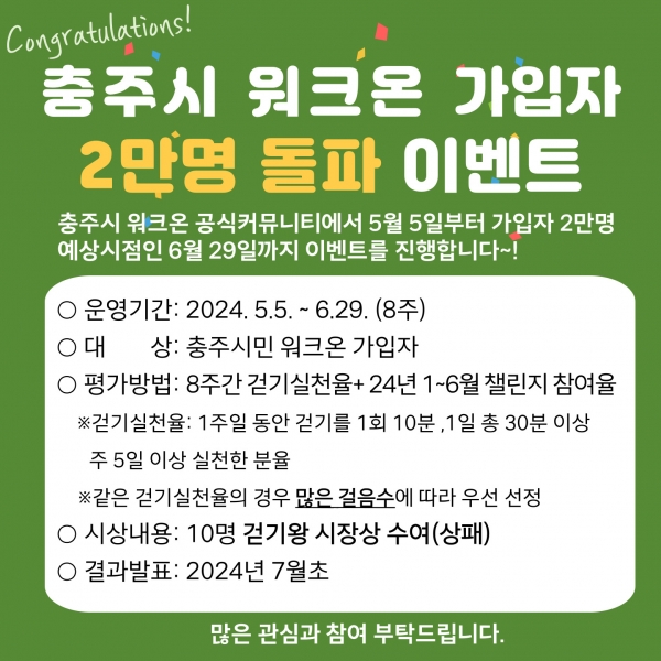 [충청뉴스큐] 충주시는 워크온 충주시 공식커뮤니티 ‘우리 함께 걸어요 동네 한바퀴’ 가입자 2만명 돌파 기념으로 ‘2024년 충주시 걷기왕 선발 이벤트’를 진행한다고 밝혔다.