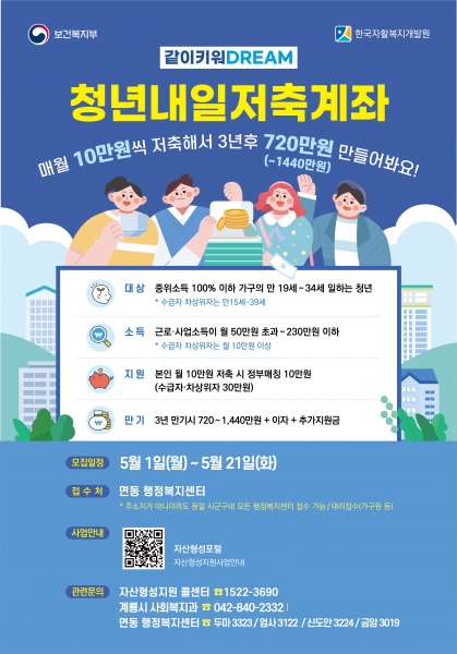 청년내일저축계좌 가입을 희망하는 청년은 주소지 관할 면·동 주민센터에 방문 신청하면 되며 방문이 어려운 청년은 복지포털 복지로를 통해서도 신청 가능하다.