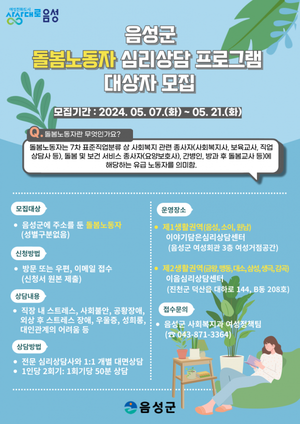 모집 대상은 음성군에 주소를 둔 돌봄노동자이며 상담 내용은 직장 내 스트레스, 사회불안, 공황장애, 외상 후 스트레스 장애, 대인관계의 어려움, 우울증, 성희롱 등이다.