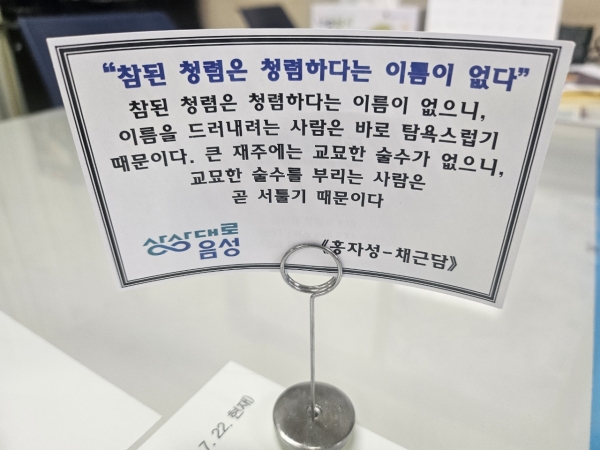 아울러 군 건설교통과는 지난 1일부터 매월 청렴 문구를 선정해 청렴 정신과 몸가짐을 배우고 실천하는 자체 청렴 시책을 특수시책으로 병행하며 청렴문화 조성에 앞장서고 있다.