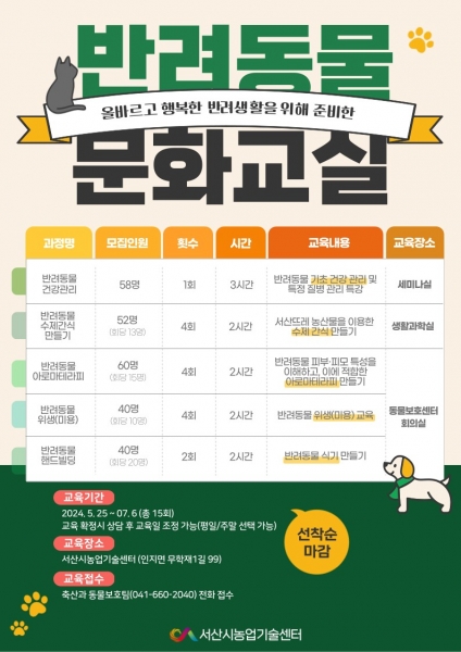 [충청뉴스큐] 충남 서산시는 성숙하고 올바른 반려동물 문화 형성을 위해 추진되는 ‘2024년 반려동물 문화교실’의 수강생을 선착순 모집한다고 13일 밝혔다.