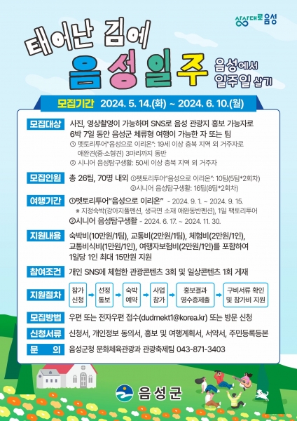 [충청뉴스큐] 음성군에서는 이달 14일부터 6월 10일까지 ‘태어난 김에 음성일주’, 음성에서 일주일 살기 참가자를 모집한다고 밝혔다.