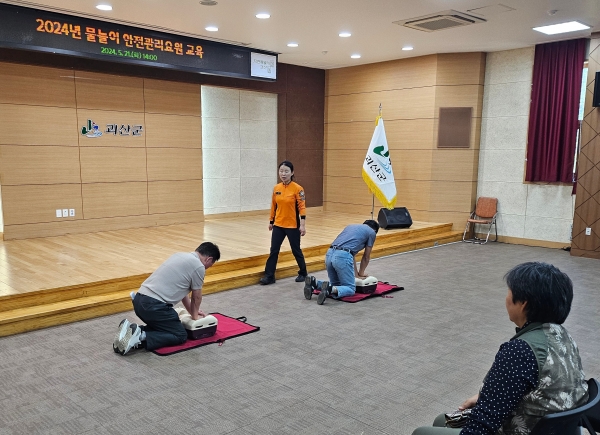 이날 교육은 괴산군 관계자의 물놀이 사고 시 대처요령, 안전요원 근무요령 등 이론교육과 괴산소방서의 구명장비 사용요령, 익수자 구조법 응급처치요령, 심폐소생술 등 현장 중심의 교육으로 진행됐다.