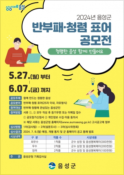 [충청뉴스큐] 음성군은 ‘함께 만드는 청렴한 음성’을 주제로 반부패·청렴 표어 공모전을 실시한다.