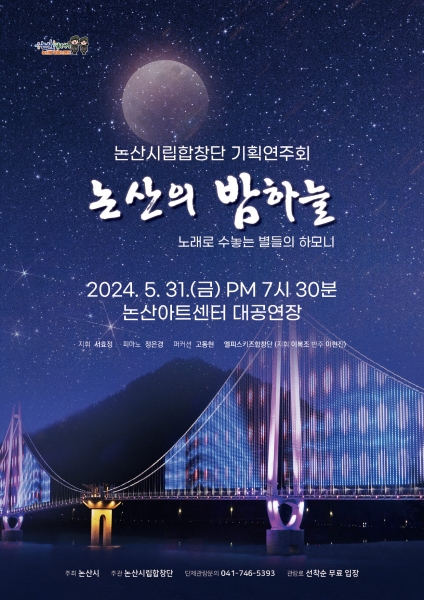 ‘논산의 밤하늘’ 이라는 제목으로 자연을 테마로 하는 이번 연주회에서 논산시립합창단이 선보일 공연은 △1부: Stella Clarr 외 2곡 △2부: 아름다운 세상 외 2곡 △3부: How Sweet The Moonlight 외 2곡 △4부: 다시 피는 꽃 외 3곡 등 총 4부로 구성되어 있으며 정통 클래식부터 현대적인 합창곡에 이르기까지 다양한 곡들이 공연될 예정이다.