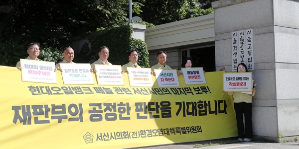 이날 전)환경특위 위원인 한석화, 최동묵, 강문수, 문수기, 안효돈, 이경화, 조동식 의원 등 7명은 서울중앙지방법원 정문 앞에서 HD현대오일뱅크를 규탄하는 현수막과 함께 문안을 낭독한 후 공판을 방청했다.