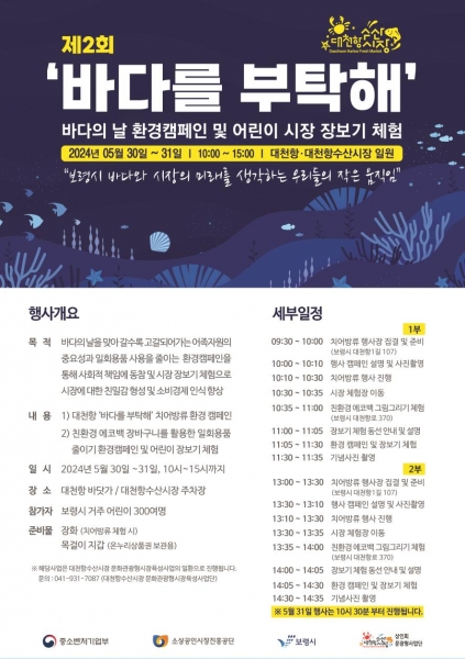 [충청뉴스큐] 보령시는 오는 30일부터 31일 이틀간 대천항에서 우리가 앞으로 살아갈 건강한 생태계 조성을 바라며‘바다를 부탁해’환경캠페인을 개최한다고 밝혔다.