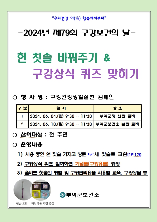 또한, 6월 4일 부여군청과 6월 10일 부여군보건소에서 오전에 △구강건강실천 캠페인 일환으로 전 주민이 참여하는헌 칫솔 바꿔주기, 구강상식 O X 퀴즈 등을 통해 기념품을 증정할 예정이다.