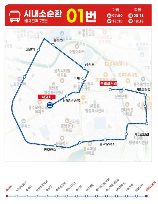 시내 소순환노선은 총 4개 노선으로 노선번호 △01번은 문화동, 봉방동 지역 △02번 용산동, 호암동 지역 △03번은 갱고개, 연수동 지역 △04번은 칠금, 탄금공원 지역을 운행한다.