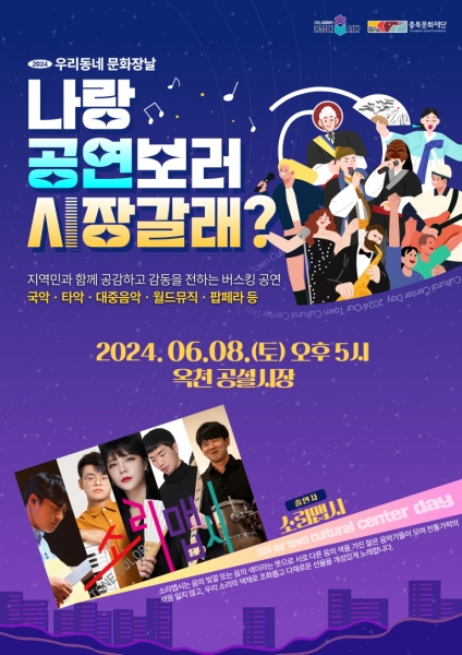 [충청뉴스큐] 충북 옥천군은 이달 8일과 22일 옥천공설시장에서 우리동네 문화장날 ‘나랑 공연보러 시장갈래?’ 버스킹 공연이 열린다고 밝혔다.