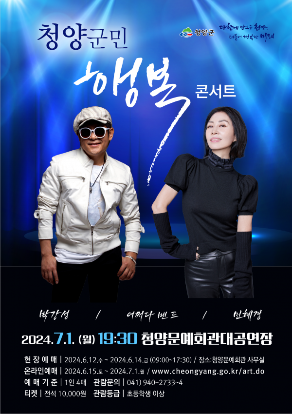 이번 ‘청양군민 행복 콘서트’에는 초대 가수 박강성과 민해경이 출연해 주민들에게 즐겁고 흥겨운 무대를 선사한다.