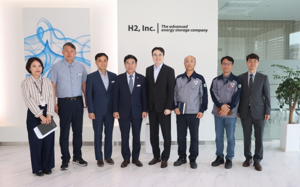이날 방문한 ㈜에이치투는 바나듐 흐름전지를 이용한 에너지저장장치를 생산하는 기업으로 해외에서도 기술력을 인정받아 독일에 제품을 수출하고 있으며 지난해 6월 5173㎡의 부지에 건축 면적 4880㎡의 공장을 준공하고 대전에서 이전했다.