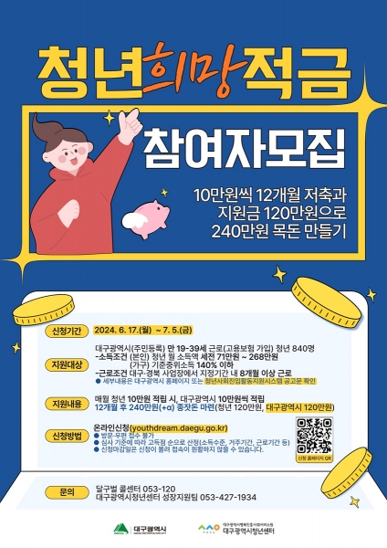 [충청뉴스큐] 대구광역시는 사회진입 초기의 근로청년들에게 소액자산 형성 경험과 기회를 마련해 주기 위해 ‘2024년 청년희망적금’ 사업 참여자를 모집한다.