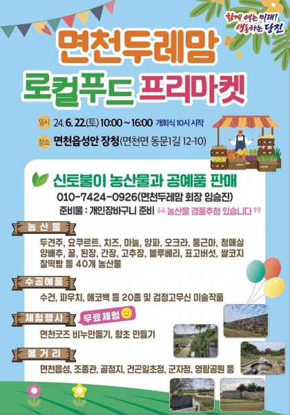 [충청뉴스큐] 면천두레맘(회장 임승진)은 오는 22일 오전 10시부터 오후 4시까지 면천읍성 안 장청에서 면천면 로컬푸드 프리마켓 행사를 진행한다.