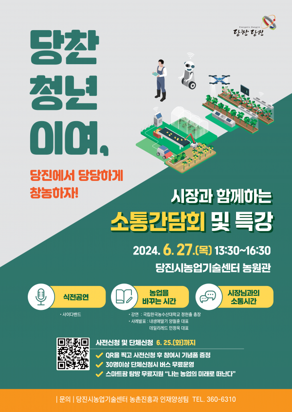 [충청뉴스큐] 당진시가 당진시장과 함께하는 청년농업인 소통간담회 및 특강이 오는 27일 당진시농업기술센터 농원관에서 개최한다고 밝혔다.