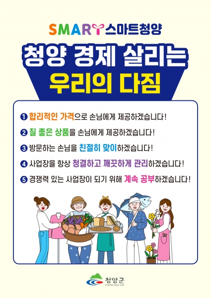 이번에 처음 제작한 소상공인용 포스터는 상인들의 5가지 다짐 문구를 넣어 소상공인들이 조금이나마 스마트청양 운동의 의미를 되새기고 동참할 수 있도록 제작됐다.