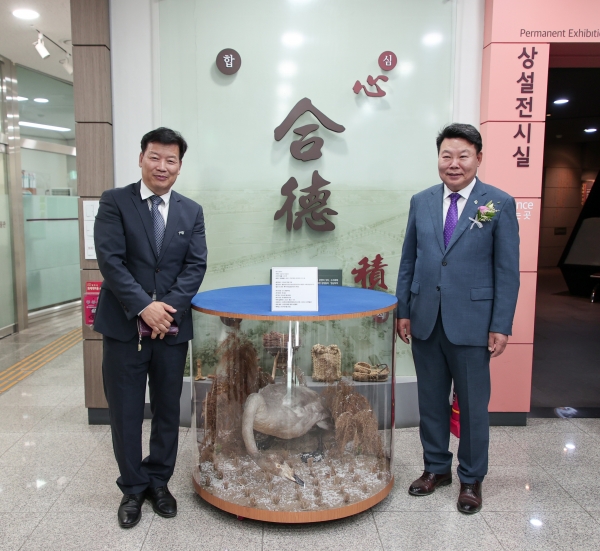 [충청뉴스큐] 당진시는 지난 21일 ‘제7회 당진합덕연꽃축제’를 맞아 천연기념물 큰 고니 표본을 기증한 자연유산 보존 유공자 이인수 씨에게 감사패를 전달했다.