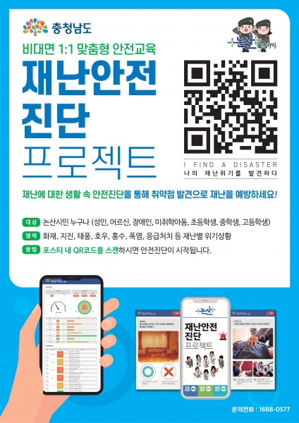 시는 재난안전 진단 포스터를 논산시청 민원실, 주민센터, 도서관, 버스정류장, 아파트 단지 내 등 배포할 계획이며 진단 희망자는 배포된 포스터 QR코드를 통해 무료로 진단을 할 수 있다.