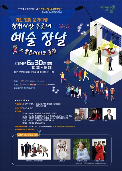 [충청뉴스큐] 충북 괴산군이 주최하고 괴산문화원이 주관하는 ‘청천장날 푸른내 예술장터’가 오는 30일 청천푸른내시장에서 열린다.