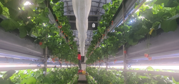 [충청뉴스큐] 논산시가 논산형 스마트팜의 일환으로 추진한 2023년 창고형 식물공장은 버섯재배사를 개조해 딸기 수직재배를 추진한 것으로 작년 3월 딸기 정식 후 올해 6월 현재까지 딸기를 생산하고 있다.