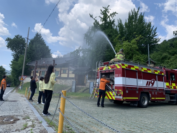 훈련은 목조문화유산 주변 화재 발생 상황을 가상해 화재 전파를 시작으로 화재진압훈련 등 재난에 대비한 소방 훈련을 실전과 같이 펼쳤다.