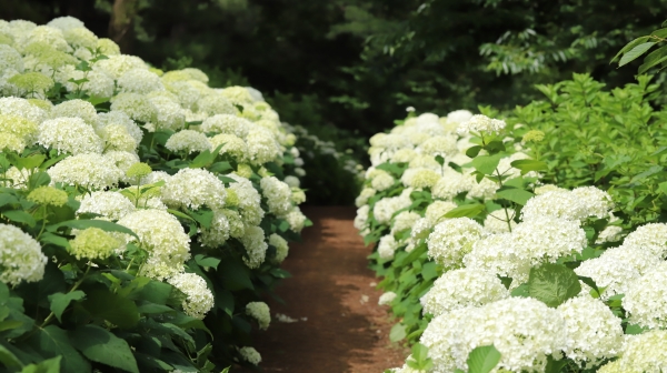 애나벨 품종이 아름다운 수국 산책길을 만들고 있으며 앞으로 열흘 정도 만개한 수국을 즐길 수 있다.