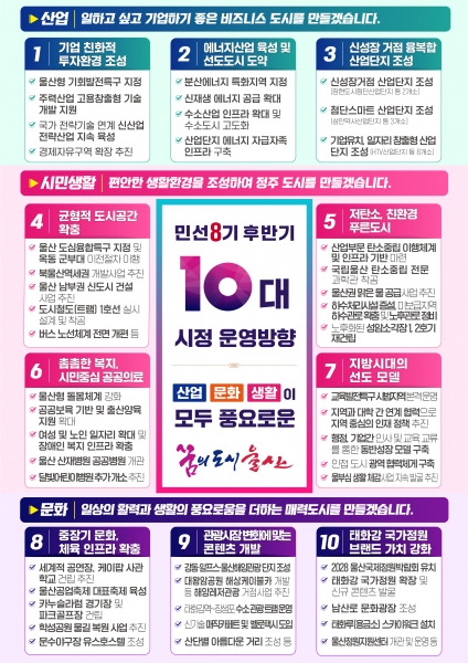 [민선8기 후반기 시정 10대 운영방향] 울산시는 후반기 시정 운영방향을 ‘‘산업’, ‘시민생활’, ‘문화’ 3개축으로 모두 풍요로운 꿈의 도시 완성’으로 정하고 3대 분야 10대 핵심과제를 추진해 나간다는 계획이다.
