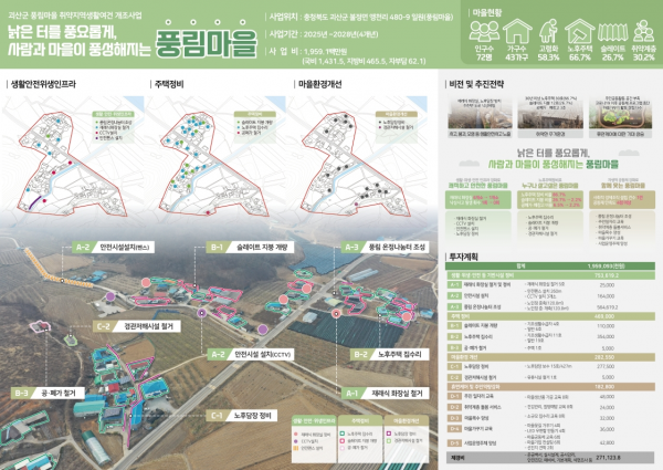 괴산군은 오는 2028년까지 신규선정마을을 대상으로 빈집 철거, 슬레이트지붕 개량, 집수리, 마을환경 개선, 담장 정비, 재래식화장실 정비 등 생활·위생 인프라정비와 함께 휴먼케어 및 주민역량강화도 함께 추진할 계획이다.