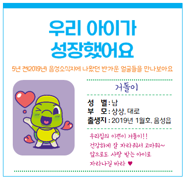 ‘우리 아이가 성장했어요’ 코너는 과거 ‘우리 아이가 태어났어요’ 코너에 참여했던 아동들이 건강하게 성장한 모습을 보여줌으로써, 군은 ‘아이 낳고 아이 키우기 좋은’ 음성군 홍보와 함께 자녀 출생의 기쁨을 다시 한번 되새기는 소중한 기회가 될 것으로 기대한다.