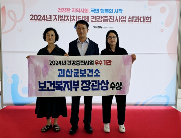 [충청뉴스큐] 충북 괴산군 보건소가 5일에 열린 ‘2024년 지방자치단체 건강증진사업 성과대회’에서 통합건강증진사업 종합부문 우수기관으로 선정돼 보건복지부장관 표창을 받았다고 밝혔다.