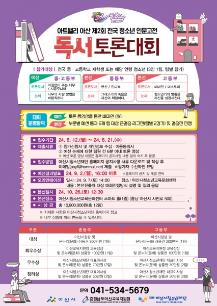 [충청뉴스큐] 아산시가 ‘아트밸리 아산 제2회 전국 청소년 인문고전 독서 토론대회’ 참가자를 오는 8월 12일부터 모집한다.