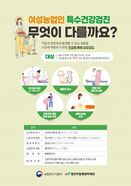 여성농업인 특수건강검진 사업은 농림축산식품부가 주관하는 공모사업으로 농업경영체에 등록된 만 51세~70세 연령 중 짝수년도 여성농업인 대상으로 한다.