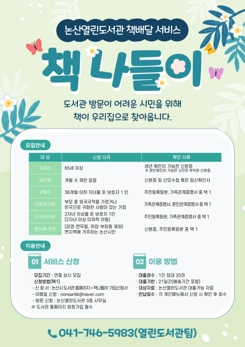‘책 나들이’는 정보취약계층 대상자가 논산시 도서관 홈페이지 및 유선으로 직접 도서를 신청하면 7일 이내에 원하는 장소에 배달 또는 회수하는 서비스로 1회에 최대 20권까지 3주간 이용이 가능하다.